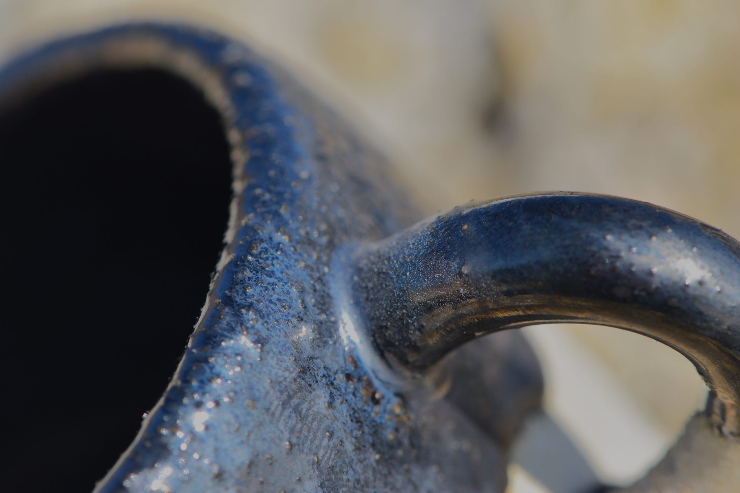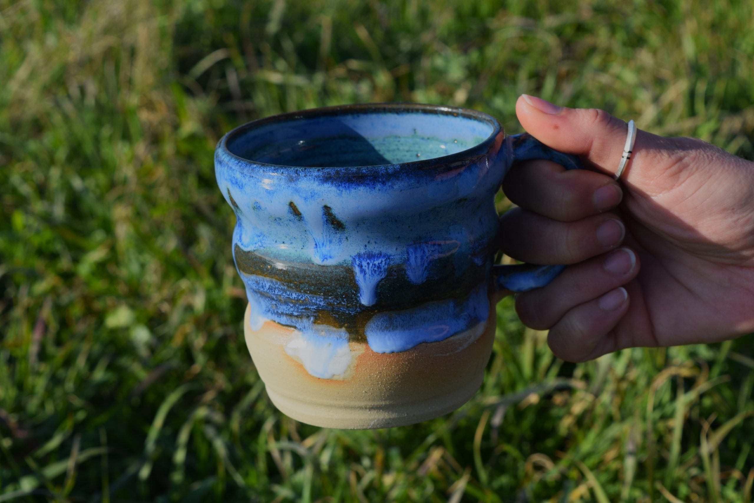 Les tasses en grès sont chaleureuses et faites de sorte à sentir le contraste entre l’email et le côté légèrement granuleux de la terre brute, c’est pour cela que mes pièces ne sont émaillées que de moitié!